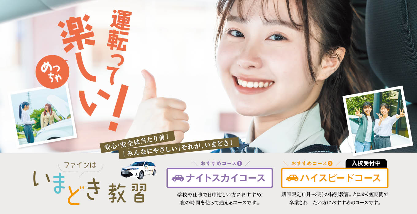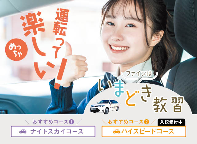 ファインモータースクール上尾は60年にわたり地域の皆さまにご利用いただいている上尾市で唯一の指定自動車教習所です。周辺地域の伊奈町、桶川市、蓮田市、白岡市からも通われている方がいらっしゃいます。準中型など普通車以外の取扱車種も多く、教習コースが広いのが特徴で、のびのびと教習を受けることが可能です。