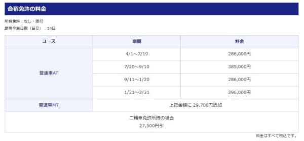 | 卒業日数 | AT車:最短13日~ MT車:最短16日~ | AT車:最短13日~ MT車:最短16日~ | AT車:最短14日~ MT車:最短16日~ |